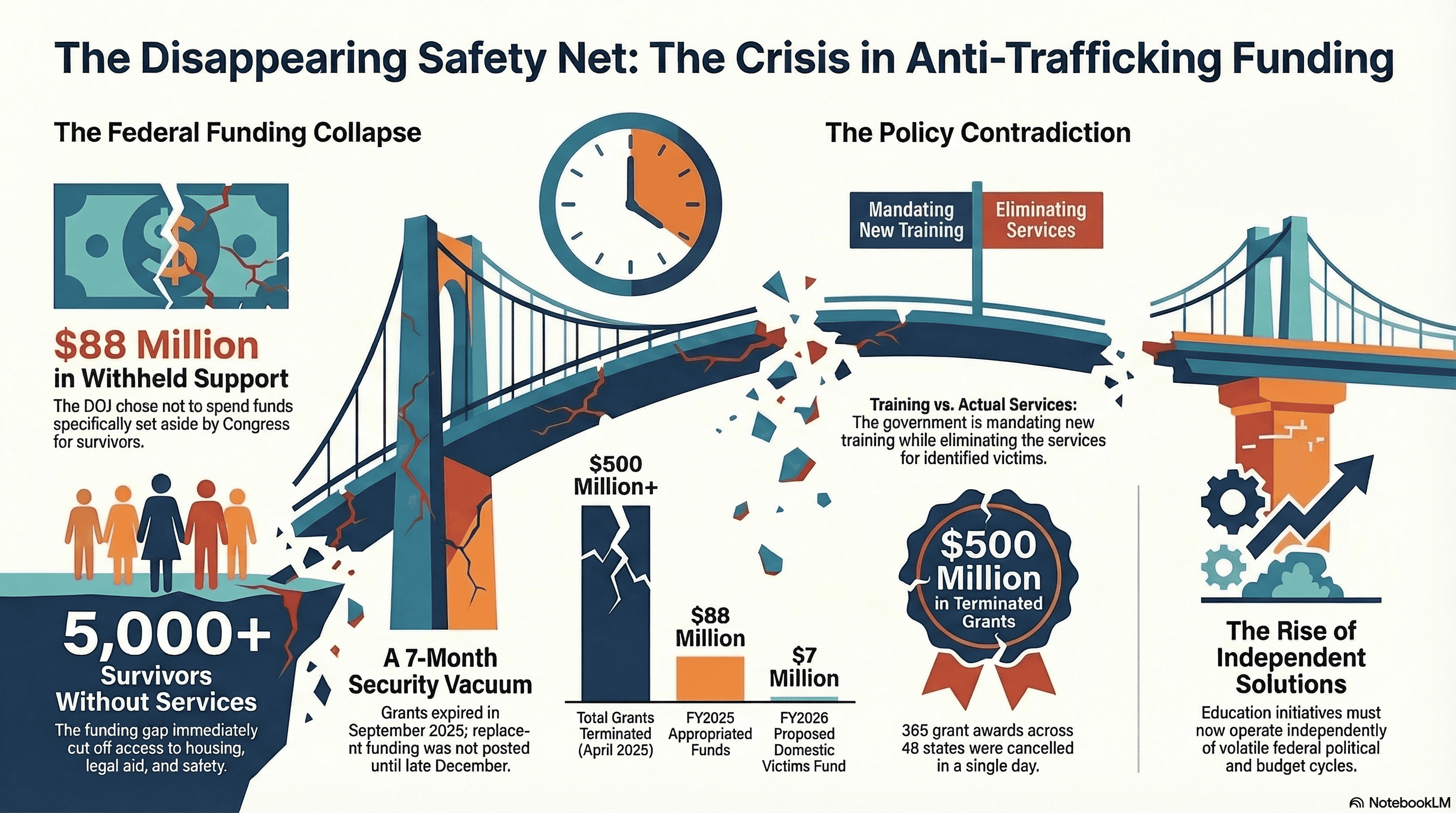 On September 30, 2025, federal funding for more than 100 organizations providing direct services to trafficking survivors expired. This was not a surprise. These grants operate on known cycles. What was different this time is that the Department of Justice had not announced new funding opportunities to replace them.